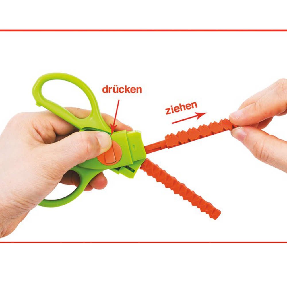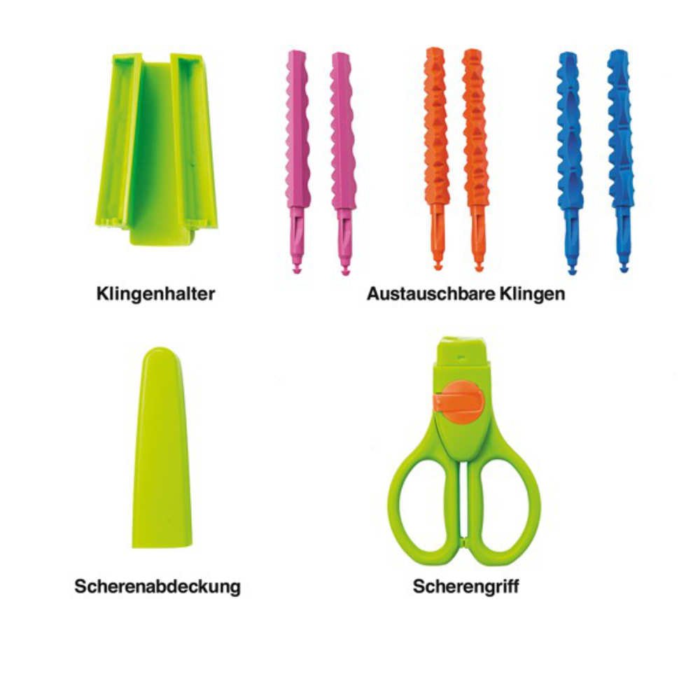 Bunte Konturenschere mit 9 austauschbaren Klingen für tolle Schnittmuster. Die farbigen Klingen lassen sich durch einen Klick leicht austauschen, somit braucht sie nicht viel Platz. Wir empfehlen die Schere ab 3 Jahre.