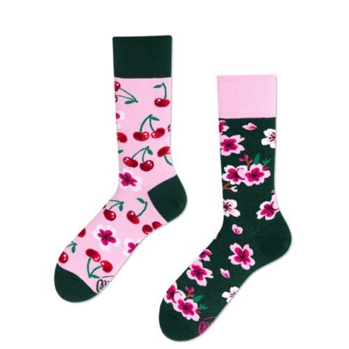 Socken mit Kirschen zeigen die atemberaubende Schönheit des blühenden Fruchtbaumes und seiner Früchte. Die Socken bestehen zu 80 % aus Baumwolle und werden in der EU hergestellt.